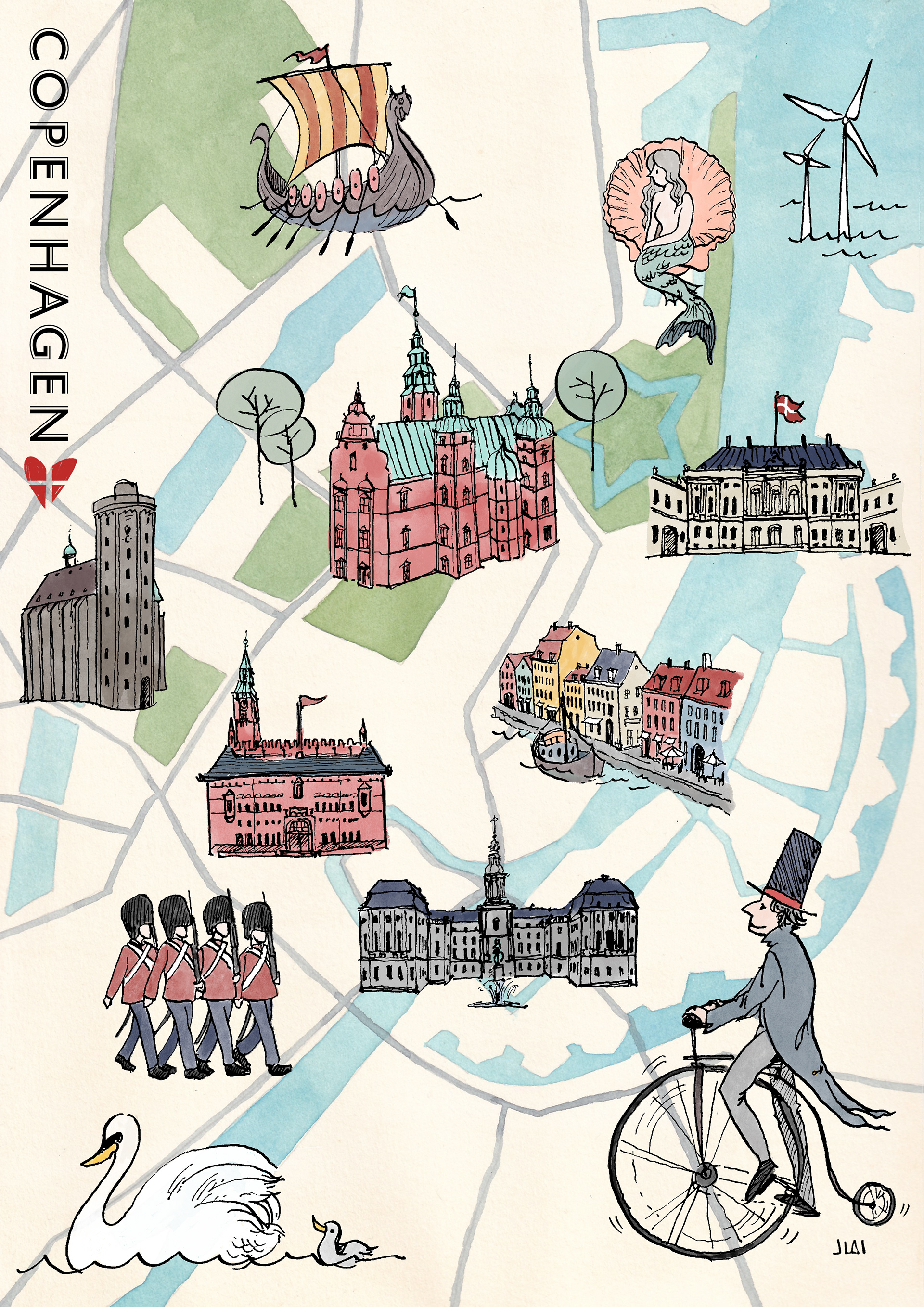 10 Original designs were commissioned by HC Andersen Copenhagen for a series of stationary merchandise, magnets, tea towels, and other goodies. All designs show cases different aspects and significant locations of Copenhagen, Denmark. Humor and hygge were the focus of the designs aided by the bright colors and fun compositions. Illustrations were done in a combination of watercolor, acrylic gouache, ink and digital colorization.